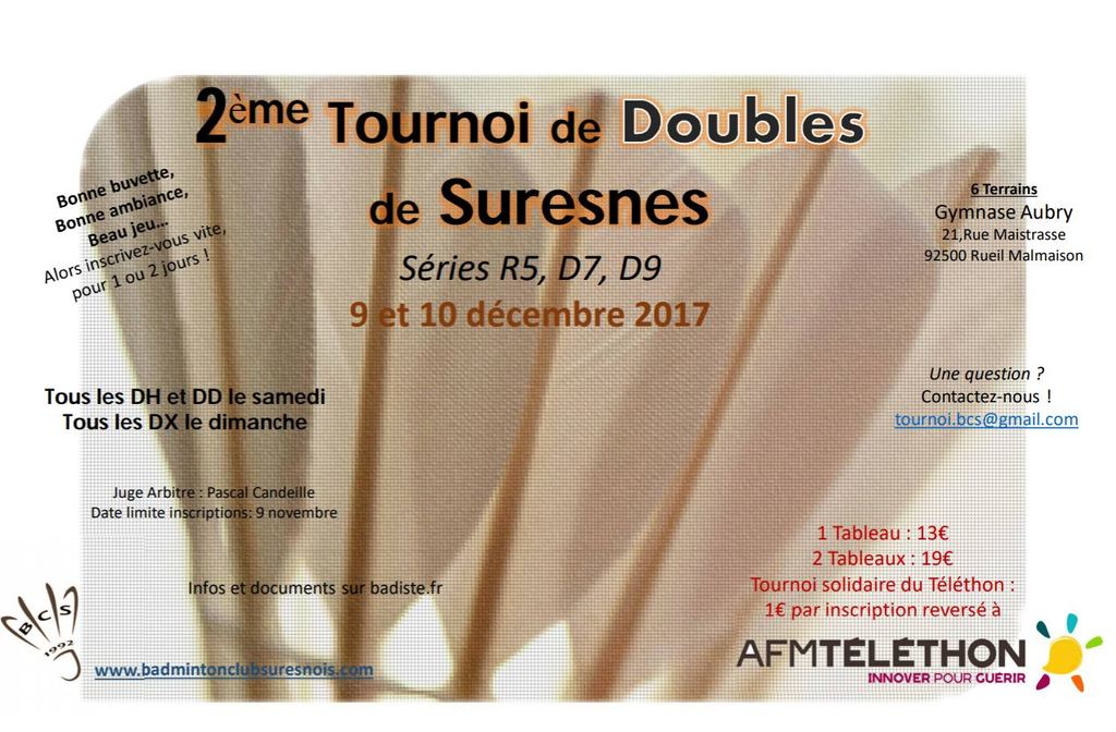 La 2ème édition du Tournoi de doubles de SURESNES se déroulera les 09 et 10 décembre 2017 au gymnase Aubry et sera partenaire du Téléthon !