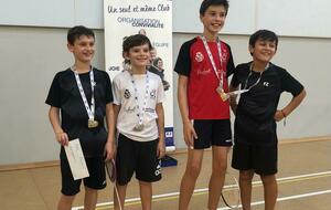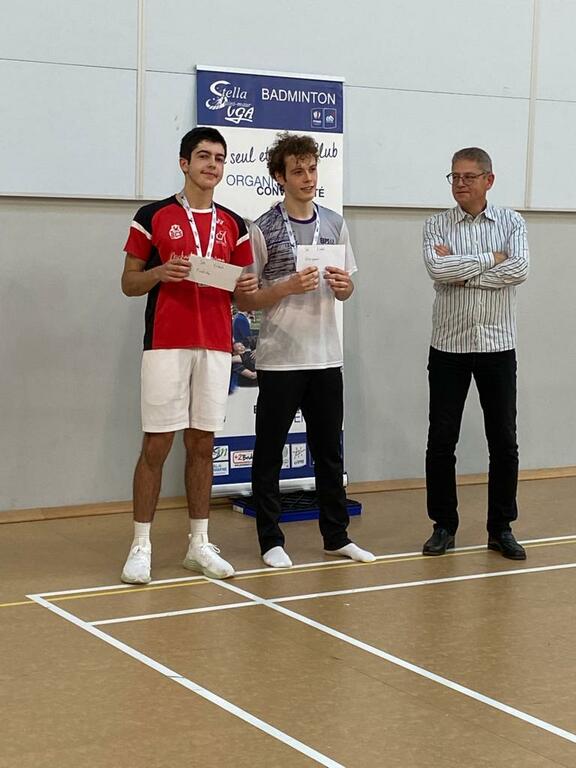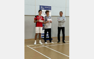 Lilian HILLAIRET (D7, minime 2), affronte en 1/8 un 1er adversaire un peu moins fort, et après un excellent début de set menant 11-2, il commence à se relacher et son adversaire à montrer un peu plus de combativité, pour une victoire 21-12. Le 2e set est plus équilibré avec un Lilian plus crispé mais restant toujours au contact jusqu'au money time où Lilian accélère et fait preuve de plus de lucidité : victoire 21-19 ! En quart de finale, il affronte la tds3 (R5, cad 1), 1er set très difficile où son adversaire met énormément de pression sur les échanges et Lilian se retrouve en retard très vite dans les échanges forçant ses coups, le 2e set plus équilibré Lilian ne lachant aucun point prend cranément sa chance, ce qui lui permet de rester au contact jusqu'au money time, mais son adversaire réaccélère sur les derniers points pour l'emporter. Dommage, un 3e set aurait été mérité, même si physiquement ça allait être dur. Défaite prometteuse 21-8, 21-19 !