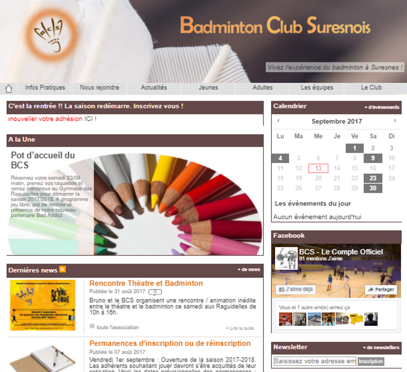 >> En résumé un site qui s'inscrit au coeur de la vie du club ou l'on trouve tous les renseignements utiles pour profiter à plein de la pratique du badminton. Et surtout à destination de tous : jeunes, parents, adultes, joueurs loisirs ou compétiteurs, capitaines d'équipes, bénévoles...